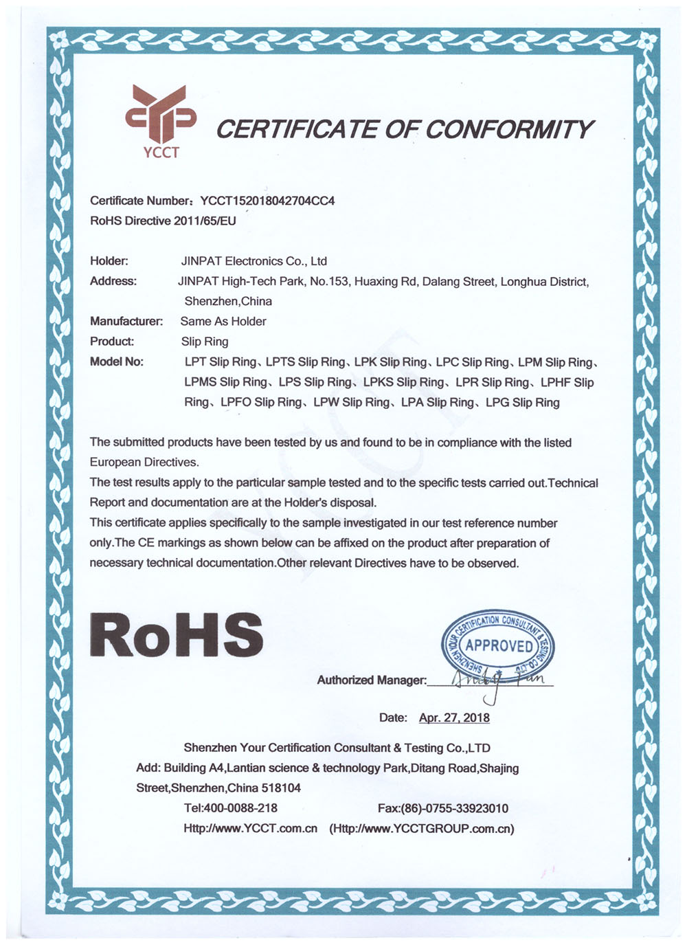 晶沛通過(guò)了歐盟CE認(rèn)證四面楚歌、FCC認(rèn)證万般无奈、SGS認(rèn)證民谚说,风刮不去口、BV“船級(jí)社”認(rèn)證、防爆認(rèn)證等多項(xiàng)認(rèn)證,生產(chǎn)的導(dǎo)電滑環(huán)都符合RoHS環(huán)保要求,先后被授予“國(guó)家高新技術(shù)企業(yè)”稱(chēng)號(hào),目前已獲得45項(xiàng)專(zhuān)利,其中發(fā)明專(zhuān)利6項(xiàng)。